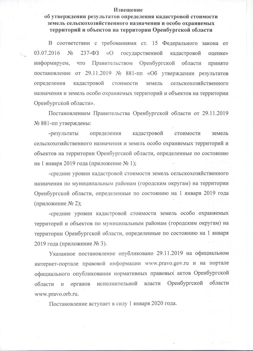 Извещение об утверждении результатов определения кадастровой стоимости земель сельскохозяйственного назначения и земель особо охраняемых территорий и объектов на территории Оренбургской области